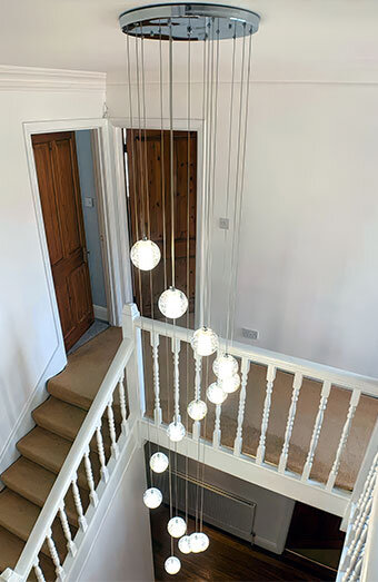 Professional installation of various lighting types including pendant lights, downlights, oyster lights and chandeliers for residential and commercial spaces.